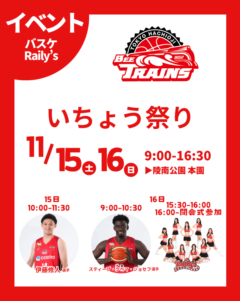 この度、11月15日(土)、16(日)に陵南公園にて開催される『八王子いちょう祭り』にシュートイベントとRaily'sパフォーマンスで参加することが決まりましたのでお知らせいたします。