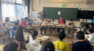 一緒にバスケを楽しんだ5年生達とおいしい給食をいただきます。
