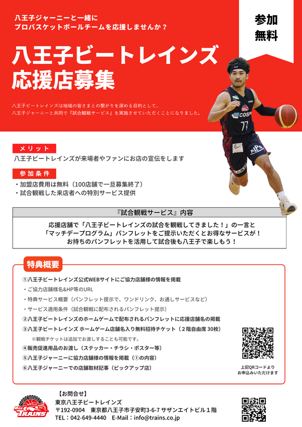 八王子ビートレインズの試合を観戦した来店者様に、特別サービスのご提供をしていただける店舗様を募集しております。詳細・お申込みは下記をご確認ください。
