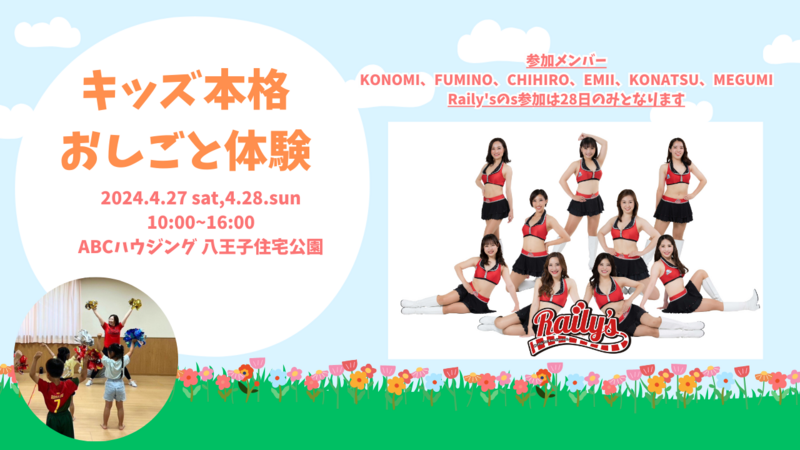 この度、ABCハウジング八王子住宅公園さま主催の『キッズ本格お仕事体験』に東京八王子ビートレインズ専属チアリーダのRaily'sが参加することとなりましたので、お知らせいたいします。
