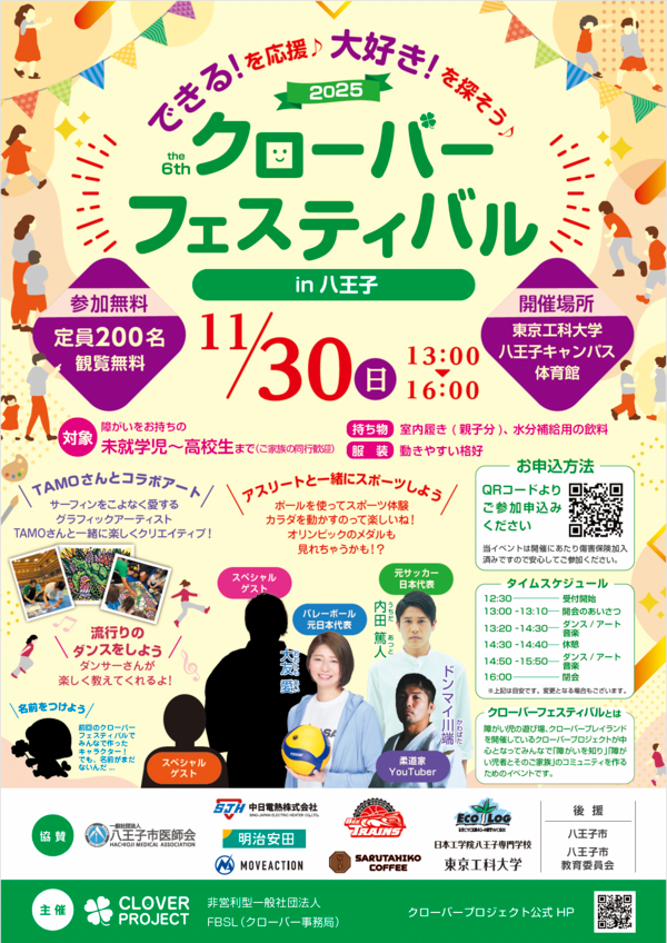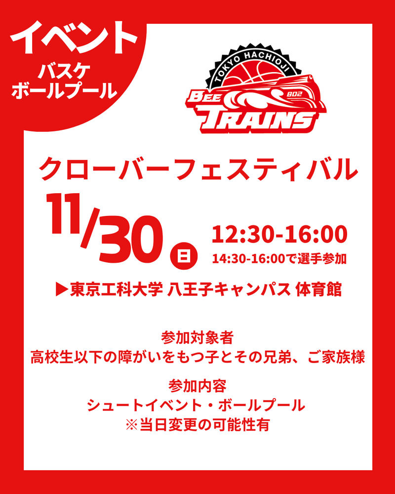 この度、11月30日(日)に東京工科大学 八王子キャンパスにて開催される『第6回クローバーフェスティバル八王子 2025 秋冬』にシュートイベントとボールプールで参加することが決まりましたのでお知らせいたします。