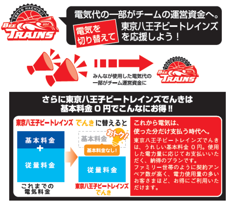 電気をLooopでんきに切り替えていただくと電気代の一部がチームの運営資金になります。また「東京八王子ビートレインズでんき」なら基本料金0円でとてもお得!