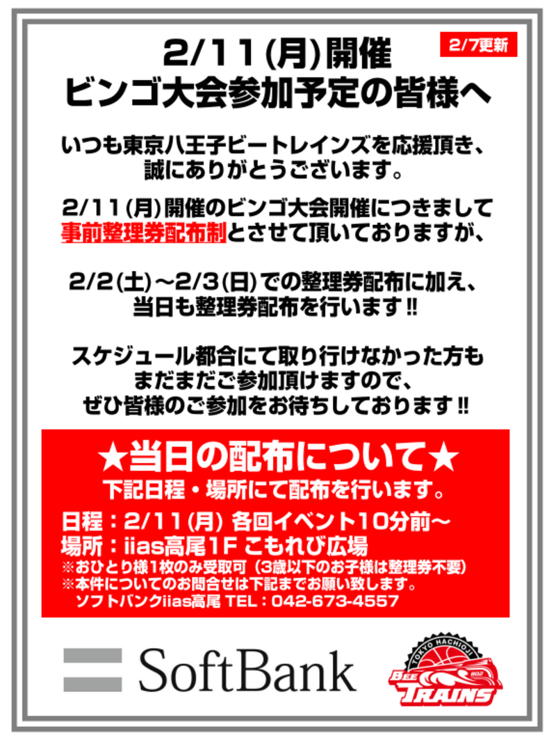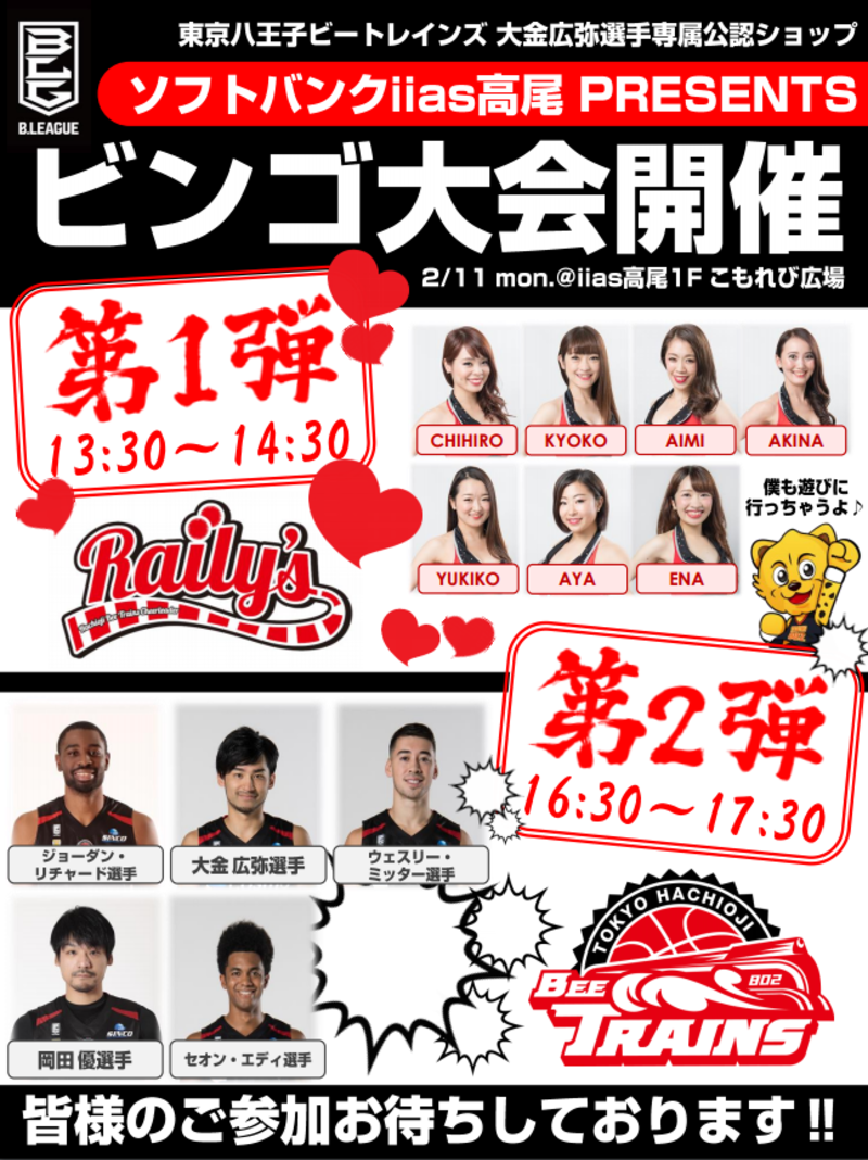 下記の日程において、ソフトバンクイーアス高尾にて行われるビンゴ大会に選手、Raily's、トレンチーが参加いたします!(※ビンゴ大会参加には整理券が必要です。)