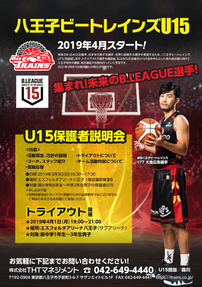 東京八王子ビートレインズでは、ユースチーム「八王子ビートレインズU15」を2019年4月にスタートいたします。B.LEAGUEのユースチームとして、B.LEAGUE主催の大会出場をメインとしたチーム活動を行ってまいります。