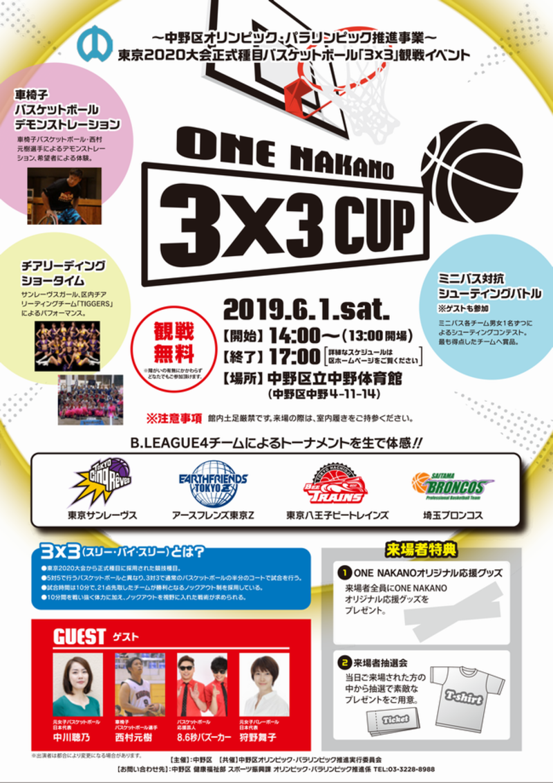 下記の日程において開催される「ONE NAKANO 3x3 CUP」に出場することとなりましたので、お知らせいたします。観戦無料です!これからのシーズン盛り上がる3x3!ぜひお越しください!