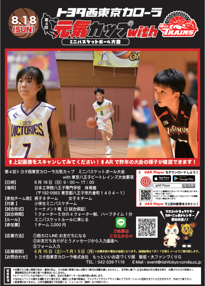 以前お知らせしておりました「第4回トヨタ西東京カローラ元気カップ ミニバスケットボール大会 with 東京八王子ビートレインズ」のお申込みが明日より開始となります!当日は八王子ビートレインズ選手、Raily's、トレンチーも参加いたします!