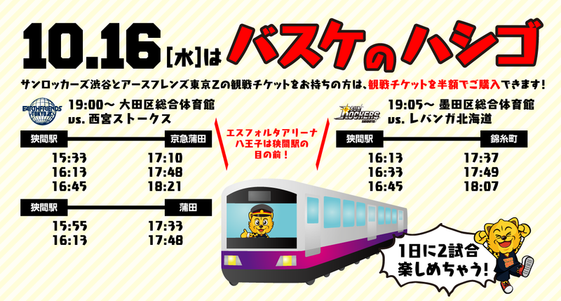 10月16日(水)に行われるサンロッカーズ渋谷(B1)またはアースフレンズ東京Z(B2)の観戦チケットをお持ちの方は「八王子ビートレインズvs岩手ビッグブルズ」の観戦チケットがなんと半額に!!!