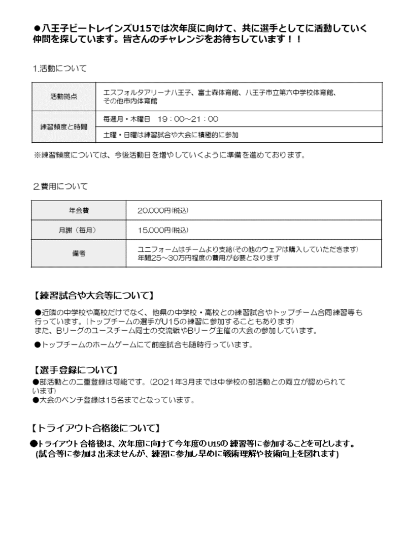 この度、八王子ビートレインズU15では2020年度第1回トライアウトを下記の日程にて開催いたします。今回は現小学6年生の男子を対象としており、トライアウト合格者は中学校に入学する前から練習に参加することが可能です。