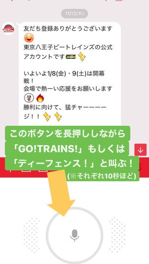 (3)音声録音ボタンを押しながら、「GO!TRAINS!」もしくは「ディーフェンス!」と叫ぶ