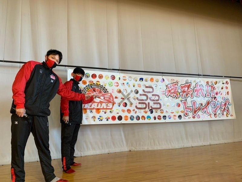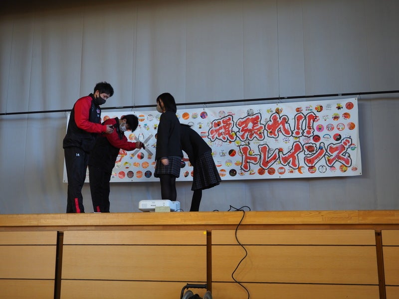 「頑張れトレインズ!」の言葉加え、横断幕には生徒一人ひとりが手作りしてくれたステッカーが貼られています。授業を通じて初めてトレインズを知ってくれた生徒も多く、トレインズのことを調べながら作成してくれました。
