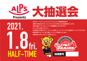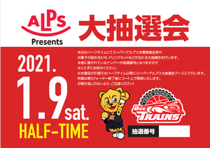 恒例のスーパーアルプス大抽選会!美味しい・嬉しい賞品が盛りだくさん!! 抽選券は入場時にお一人様1枚ずつお渡しいたします。 ハーフタイムよりロビー「スーパーアルプス大抽選会」ブースに当選番号を発表いたします。 1等&特賞は第3クォーター終了後にアナウンスいたします! お見逃し、お聞き逃しのないようにご注意ください!