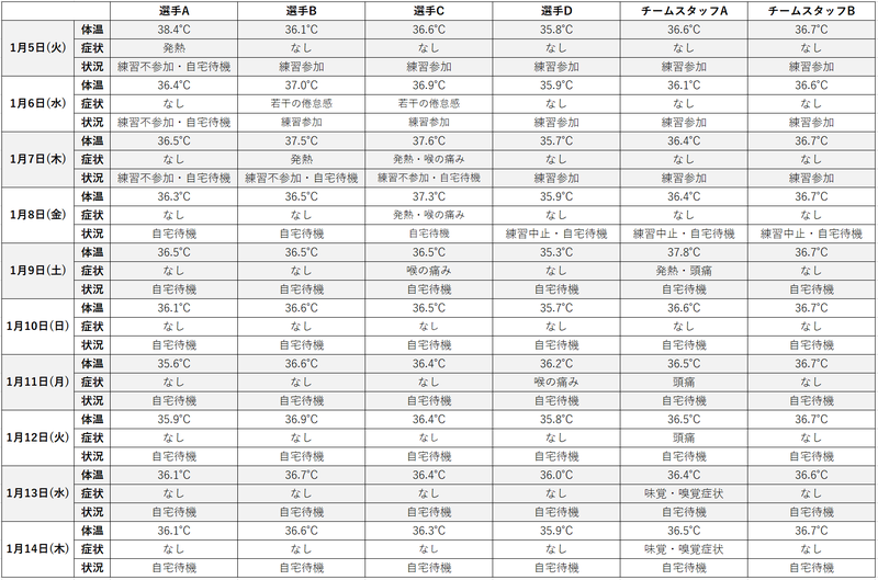 前日の夜に選手Bは37.4℃、選手Cは37.6℃の発熱があった報告を受け、午後にPCR検査を実施し、夕方に陽性判定。クラブの判断で直ちに当該選手を除く選手及びチームスタッフがPCR検査を実施。