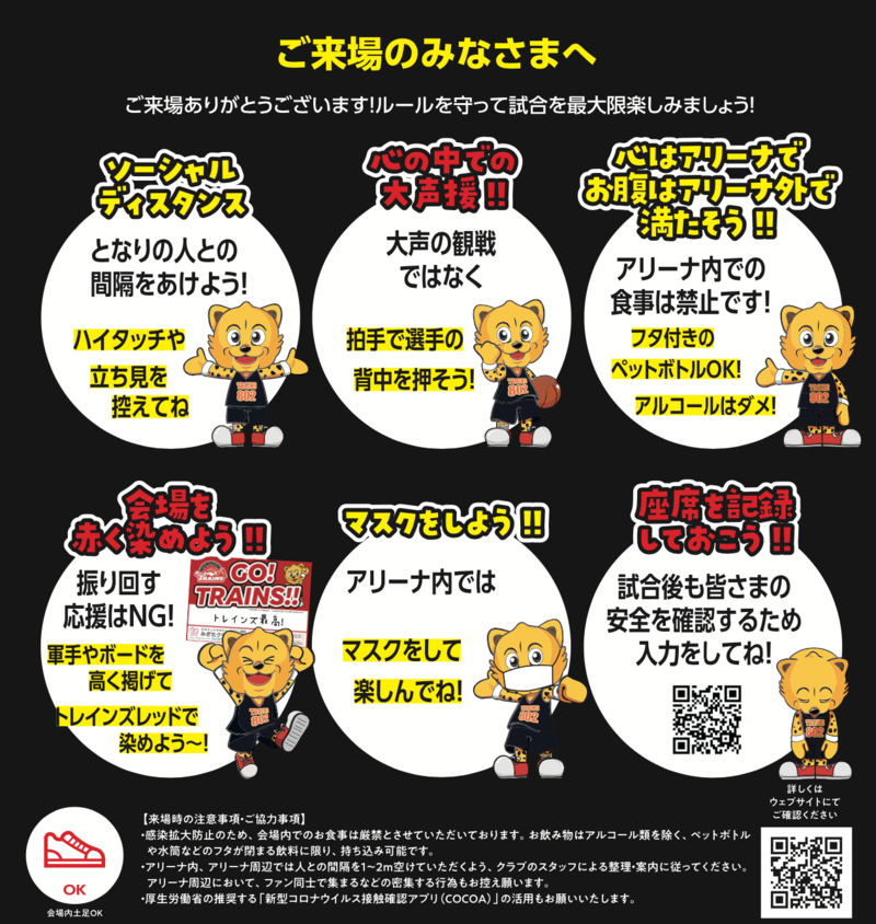 ・ご来場の際は、必ずマスクをご持参のうえ、アリーナ内では飛沫感染を予防するためにマスクを着用をお願いします。
