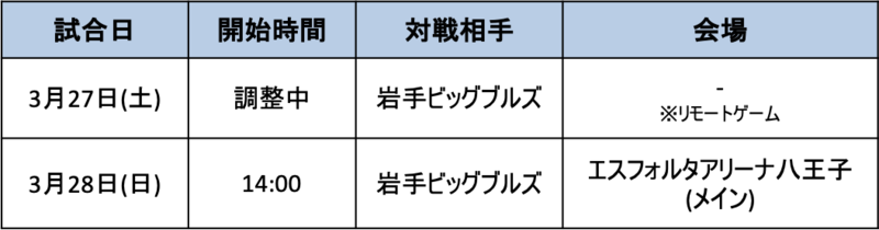 ※3/27(土)の試合は、無観客のリモートゲームにて開催予定です。3/28(日)は有観客にて行います。