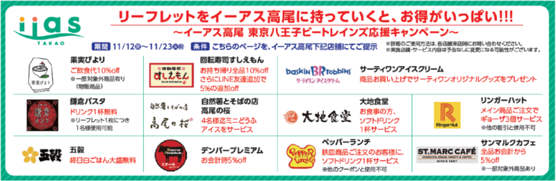 「イーアス高尾」様は、ファッション・グルメなど幅広い品揃え・サービスを展開している八王子最大級のショッピングセンターです。この度は、八王子をより一層盛り上げるべく八王子ビートレインズとのコラボイベントを実施することとなりました。コラボ第二弾となる今回は、イーアス高尾飲食店による特別サービス!11月12日(金)・11月13日(土)にて配布するマッチデープログラムをイーアス高尾内の対象店舗にお持ちいただくと、特別サービスを受けることができます。