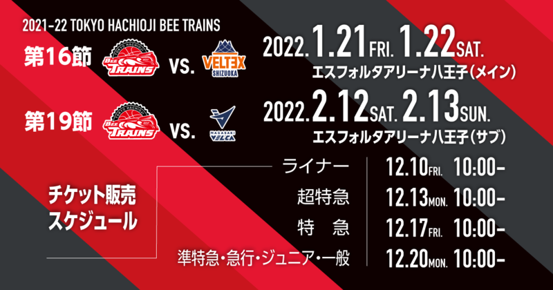 1月21日・22日vs.ベルテックス静岡戦、2月12日・13日vs.長崎ヴェルカ戦のチケット販売スケジュールが決定しましたので、お知らせ致します。