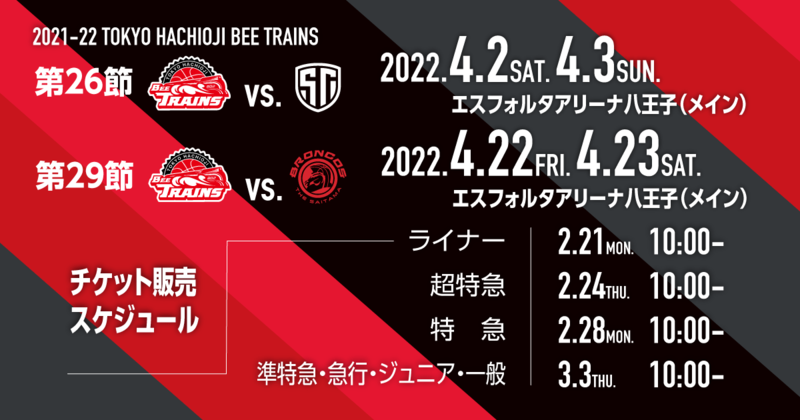 4月2日・3日vs.しながわシティバスケットボールクラブ戦、4月22日・23日vs.さいたまブロンコス戦のチケット販売スケジュールが決定しましたので、お知らせ致します。