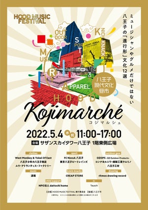 「コジマルシェ」は、当日J:COMホールで開催される「コジマケンジマツリ」を最高のテンションで楽しむために、会場駅前広場で開かれるイベントです。当イベントには、八王子のファッション、アウトドアからスポーツ、アートなど多岐に渡るエッジの効いた「進行形」文化を担うお店や団体12組が大集結!