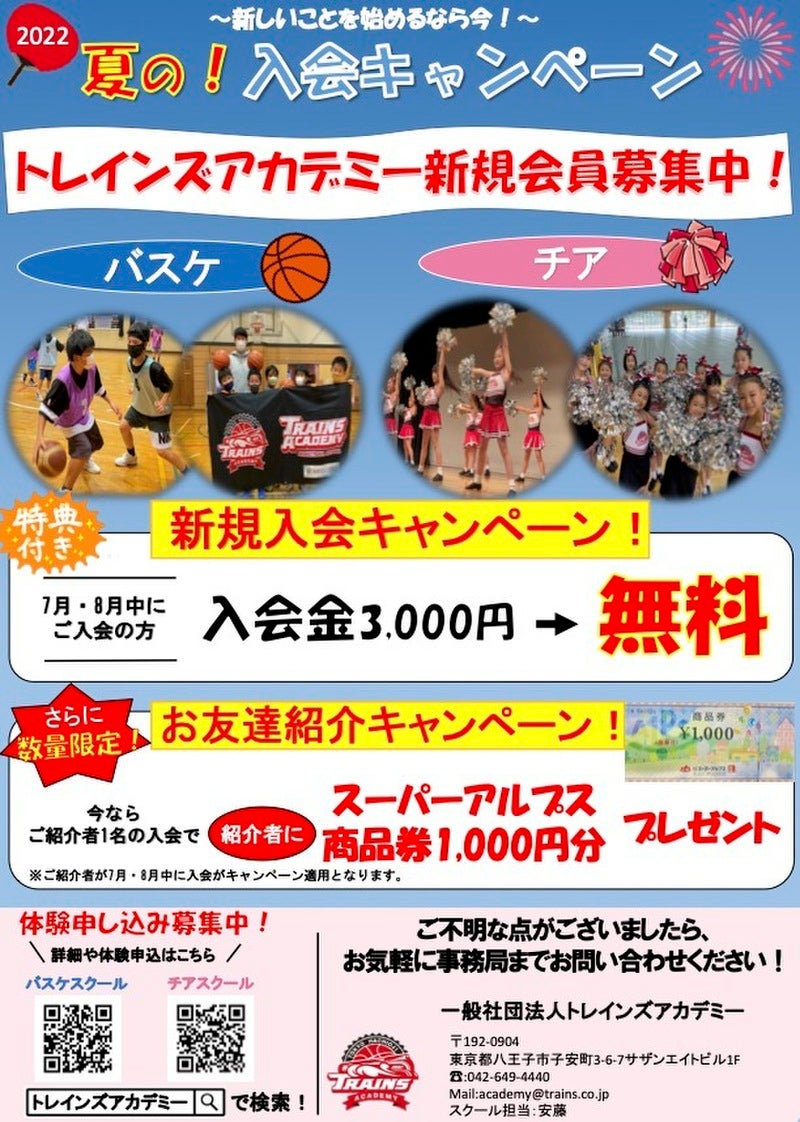 この度トレインズアカデミーでは、バスケスクール・チアスクールを対象に期間限定の『夏の!入会キャンペーン』を実施します!