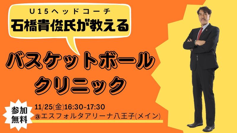11/25(金)湘南ユナイテッドBC戦では、試合前にU15 ヘッドコーチを務める『石橋貴俊』氏によるバスケットボールクリニックを開催します!!