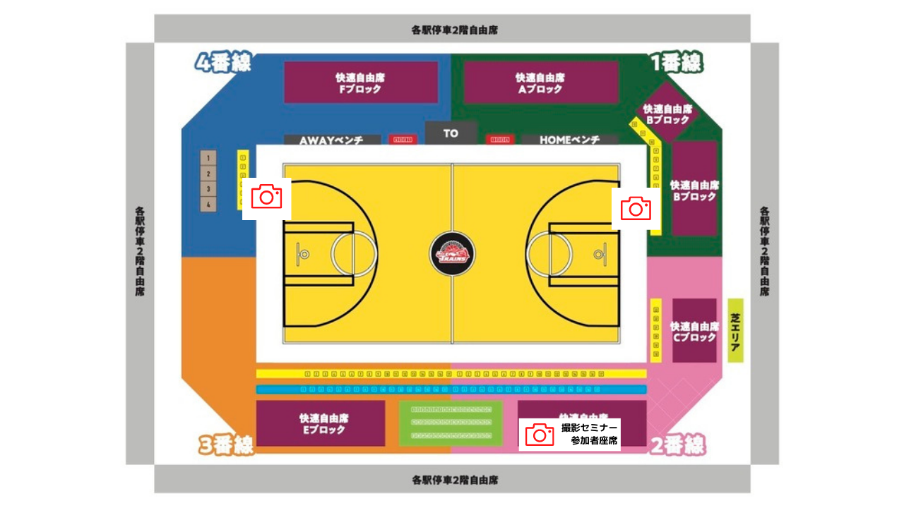 参加者の皆さまはコートエンド(HOMEベンチ側またはAWAYベンチ側)並びに座席から撮影することが可能です。コートエンドからの撮影はおひとり様1クォーターのみとなります。また、参加者の皆さまには1階快速自由席(Dブロック)をご用意いたします。座席の近くにも撮影セミナースタッフがおりますので、撮影のアドバイスなど試合中も実施いたします。