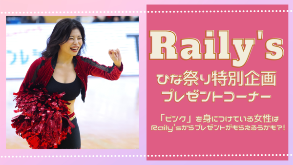 前半・後半のタイムアウトにおいて(それぞれ一回ずつ)ピンクの物を身につけている女性限定でRaily'sが当たりつきお菓子をプレゼント!