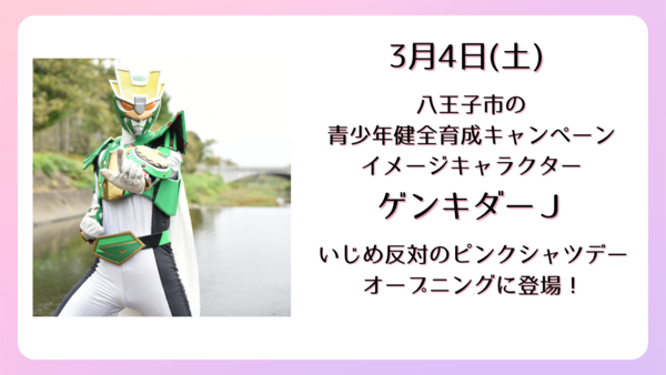 青少年健全育成キャンペーンのポスターのイメージキャラクターとして起用されているゲンキダーJが「いじめ反対」の意思表示をするピンクシャツデーに登場!