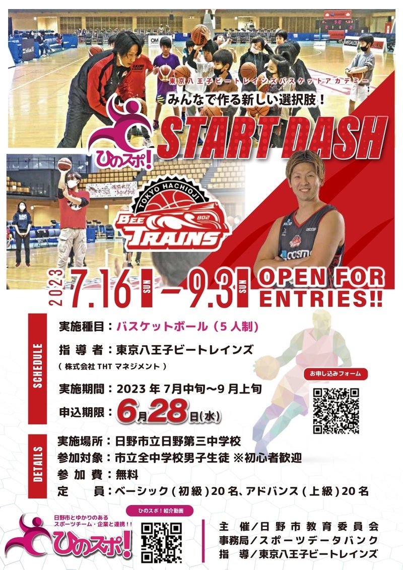 この度、東京八王子ビートレインズでは、令和5年度ひのスポ!にてバスケットボールアカデミーを実施することとなりましたのでお知らせいたします。
