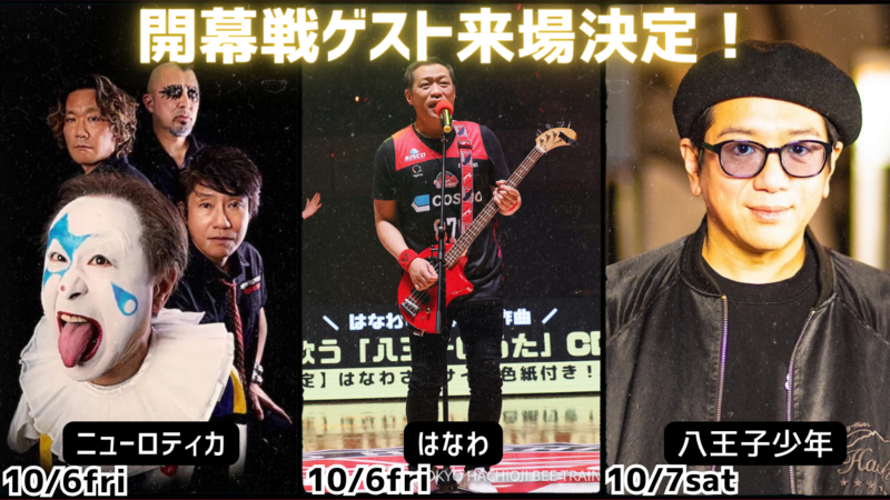 10/6(金)・10/7(土)に開催する2023-24シーズン ホーム開幕戦の特別ゲストとして、パンクロックバンドグループ[ニューロティカ]ボーカルのATSUSHIさん、お笑いタレントのはなわさん、八王子少年さんがご来場することになりましたので、お知らせ致します。