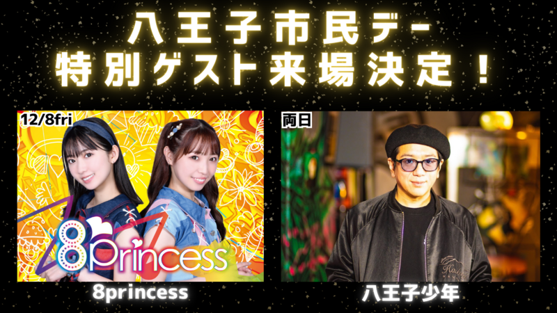 12/8(金)・12/9(土)に開催する『八王子市民デー』特別ゲストとして、8princess さん、八王子少年 さんがご来場することになりましたので、お知らせいたします。