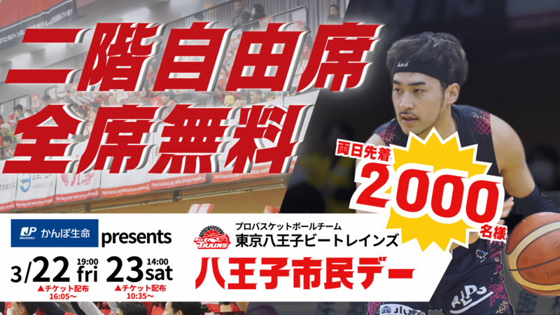 この度、3月22日(金)・23日(土)第24節ヴィアティン三重戦に開催する、『八王子市民デー』にて、大好きな八王子、そして八王子ビートレインズに関わる全ての皆さまに日頃の感謝の気持ちを込め、沢山のスポンサー様のご協力のもと二階自由席全席無料とし両日先着2,000名様をご招待することとなりましたので、お知らせいたします。