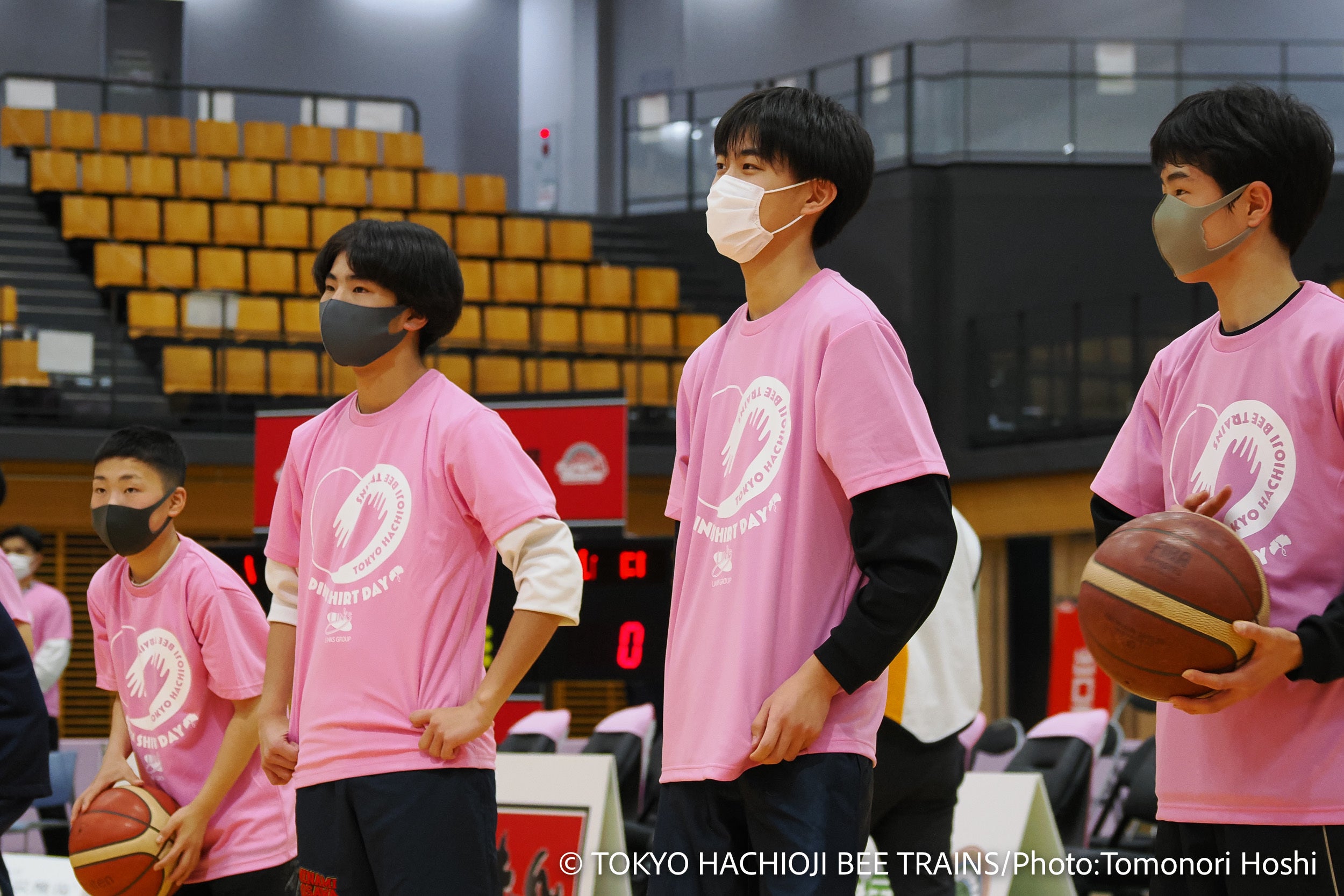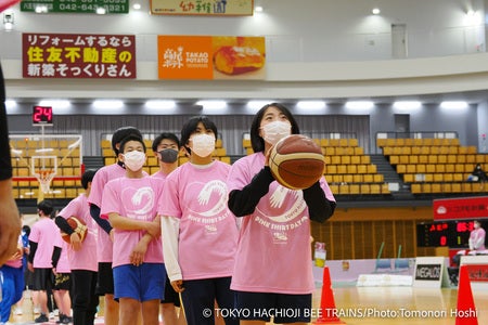 チャリティバスケ教室参加する学生は、2022-23シーズンのピンクTシャツの売り上げから生徒に寄贈したピンクTシャツを着用してバスケを学びます。
