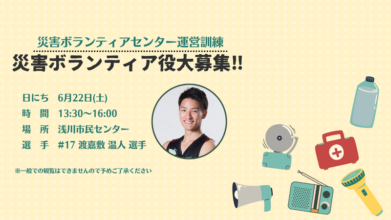 下記の日程において開催する災害ボランティアセンター運営訓練に#17 渡嘉敷 温人選手が参加することとなりましたのでお知らせいたします。