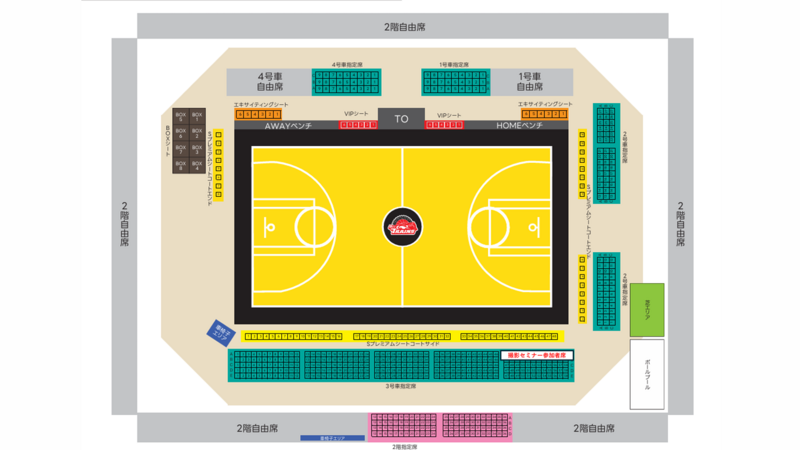 参加者の皆さまはコートエンド(HOMEベンチ側またはAWAYベンチ側)並びに座席から撮影することが可能です。コートエンドからの撮影はおひとり様2クォーターとなります。また、参加者の皆さまには3号車指定席をご用意いたします。座席の近くにも撮影セミナースタッフがおりますので、撮影のアドバイスなど試合中も実施いたします。