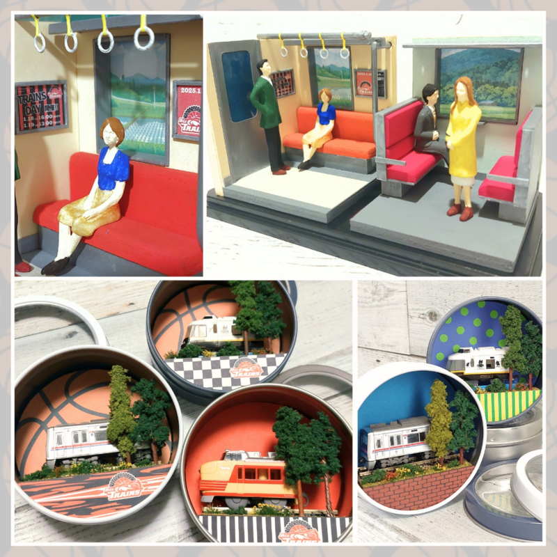 ①車内の模型作り(ボックス席、優先席の2種どちらか)②丸型ミニジオラマをご用意しました。