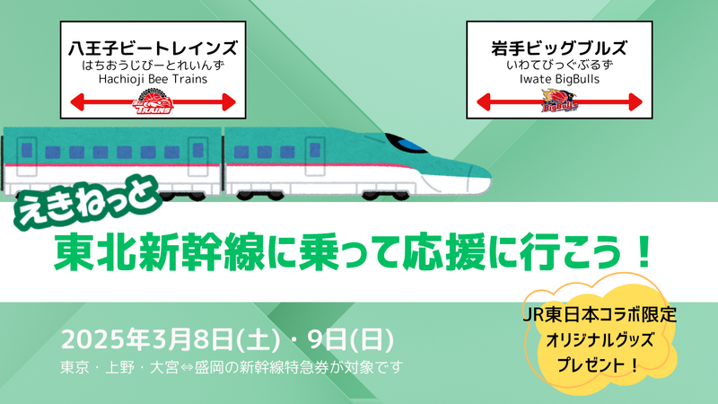 3月8日(土)・9日(日)に行われる岩手ビッグブルズ戦にて対象区間の特急券を「えきねっと」にて購入されたお客様に本企画限定オリジナルグッズをプレゼントいたします!