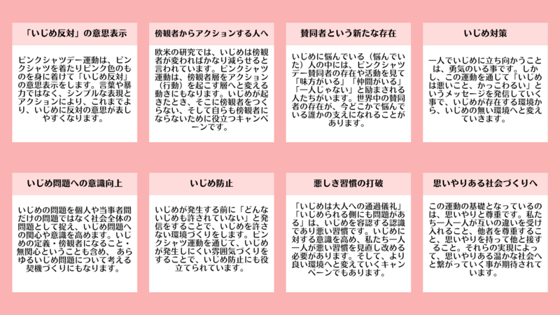 この行動がきっかけとなり、現在、カナダでは毎年2月最終水曜をピンクシャツデ―とし、この日、学校・企業・個人を含めた賛同者がピンクシャツを着て「いじめ反対」のメッセージを送っています。