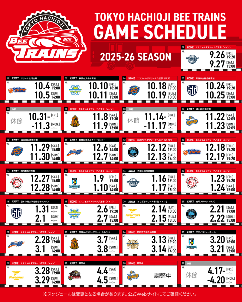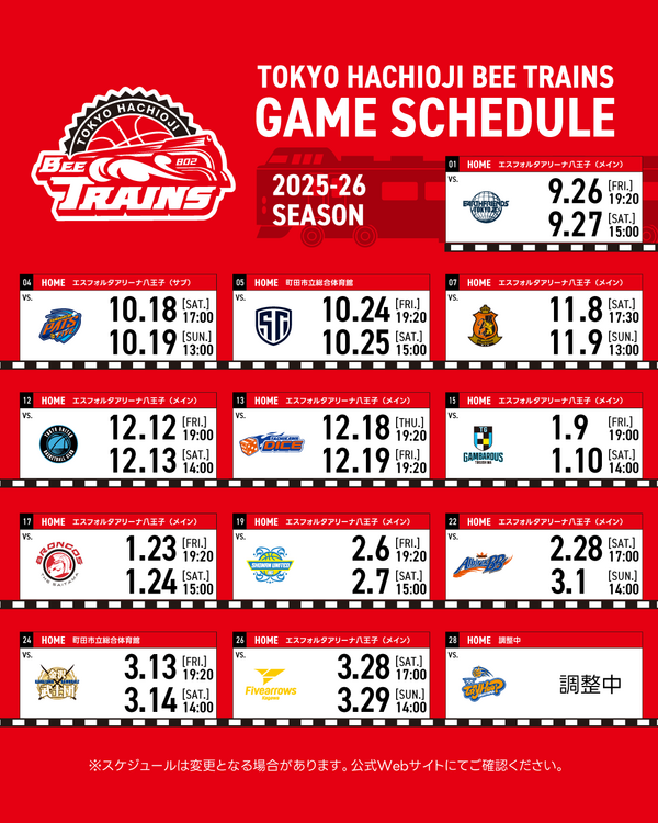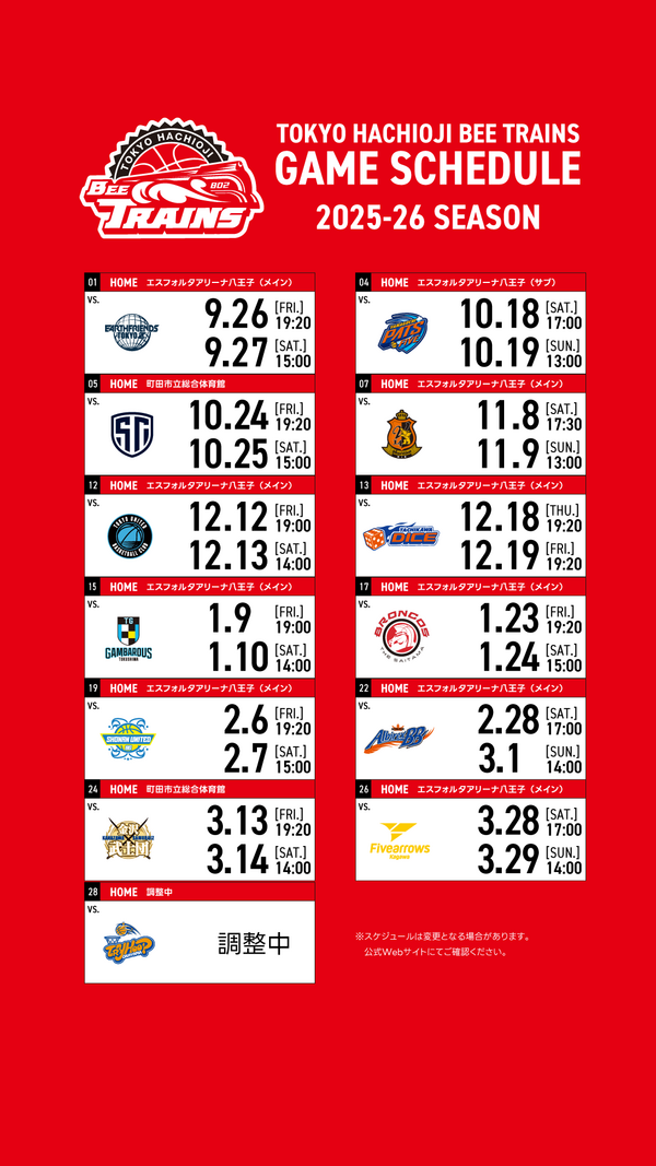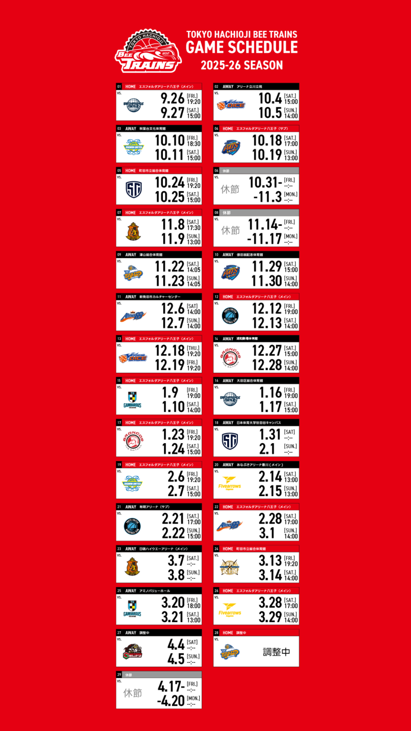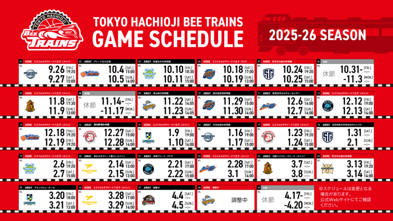 2025年9月26日(金)19:20 TIP OFF、27日(土) 15:00TIP OFFエスフォルタアリーナ八王子でお待ちしています!