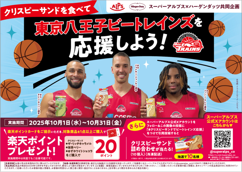 さらに!スーパーアルプス様の公式Xアカウントをフォロー&この画像の投稿に「#クリスピーサンドでビートレインズ応援」をつけて引用投稿するとクリスピーサンド詰め合わせが抽選で10名様に当たります!(10個入り)