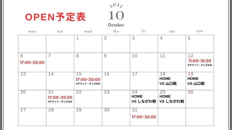 ※10月12日、15日、21日は、チケット・グッズ販売のみの対応とさせていただきます。あらかじめご了承ください。
