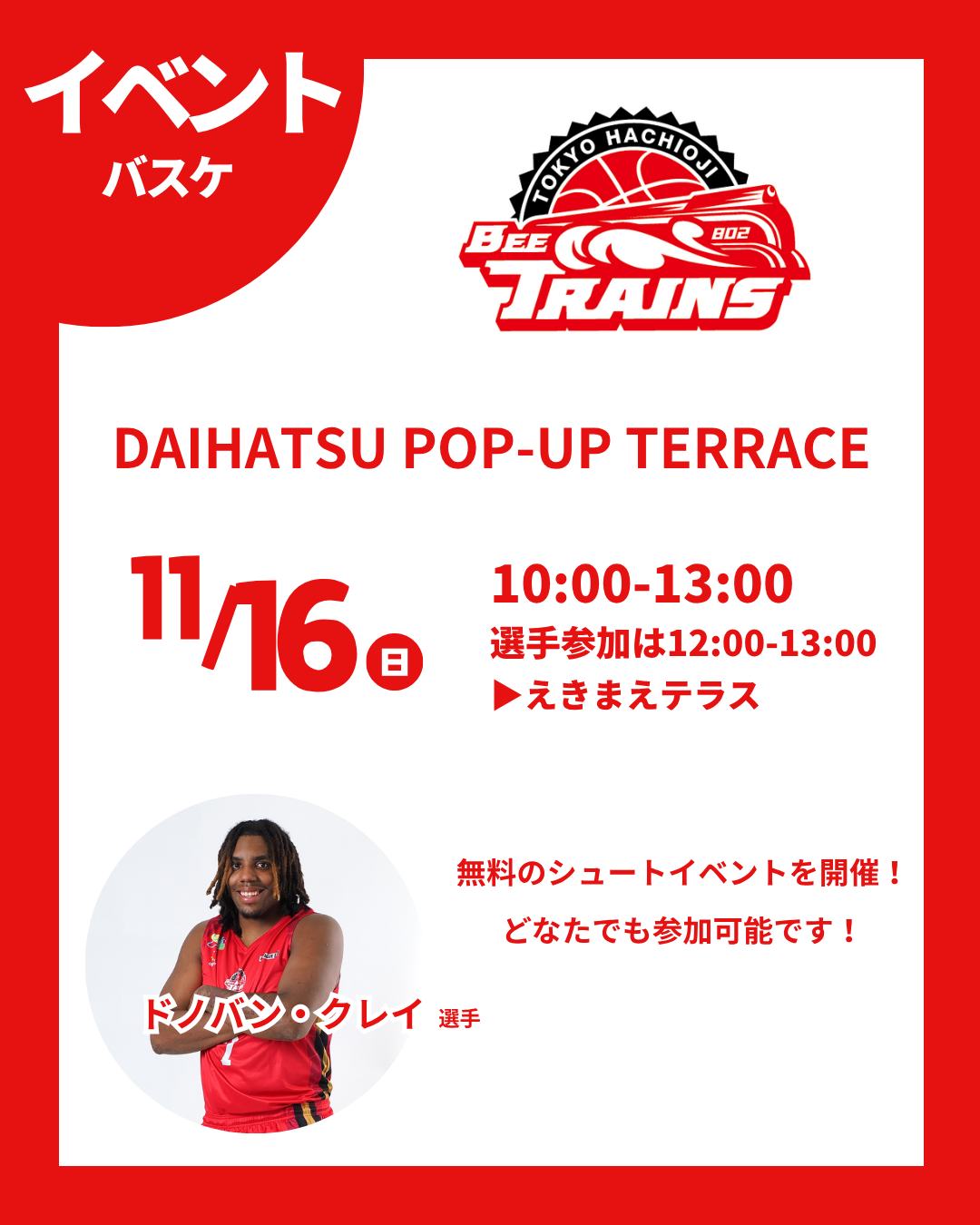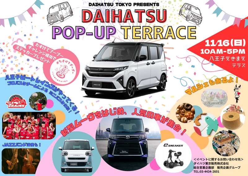 この度、11月16日(日)にえきまえテラスにて開催される『DAIHATSU POP-UP TERRACE』にシュートイベントで参加することが決まりましたのでお知らせいたします。