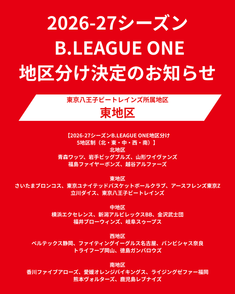 B.革新初年度となる2026-27シーズン、八王子ビートレインズは「東地区」(全5クラブ)となります。