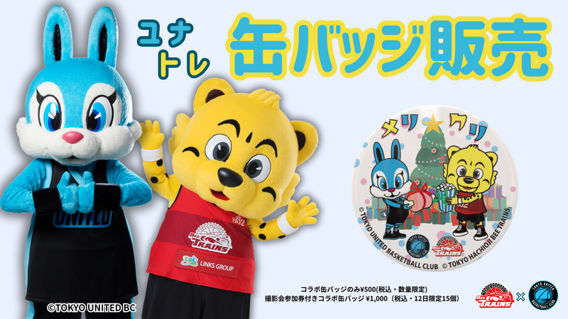 この度、第12節東京ユナイテッドバスケットボールクラブ戦において、東京ユナイテッドバスケットボールクラブのマスコット「ユナイト」とトレンチーのコラボ缶バッジの販売が決定いたしましたので、お知らせいたします。