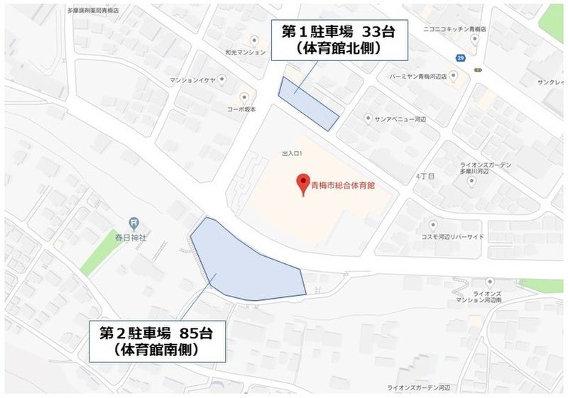 第1駐車場(体育館北側)85台(うち軽自動車15台、障がい者駐車場2台)※8:00~22:00まで