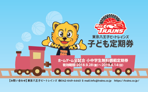 子ども定期券について・・・八王子ビートレインズでは八王子市内と日野市内の小中学生にホームゲームを無料で観戦できる「子ども定期券」を配布しています。今シーズンは9月中旬に各学校に配布させていただきました。学校から配布されていない方は、まず学校にお問い合わせください。また紛失された場合は試合会場にて再発行いたします。住所の分かるものをお持ちいただき、チケット売場にてご提示ください。