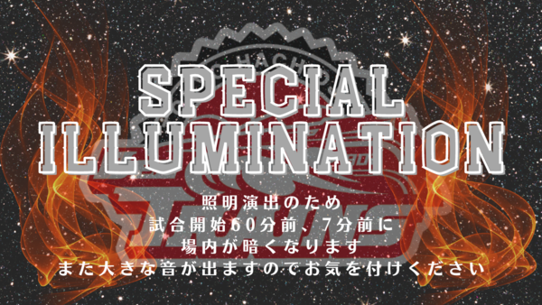 試合開始60分前、7分前に会場内が暗くなります。ぜひお早めにお越しください!