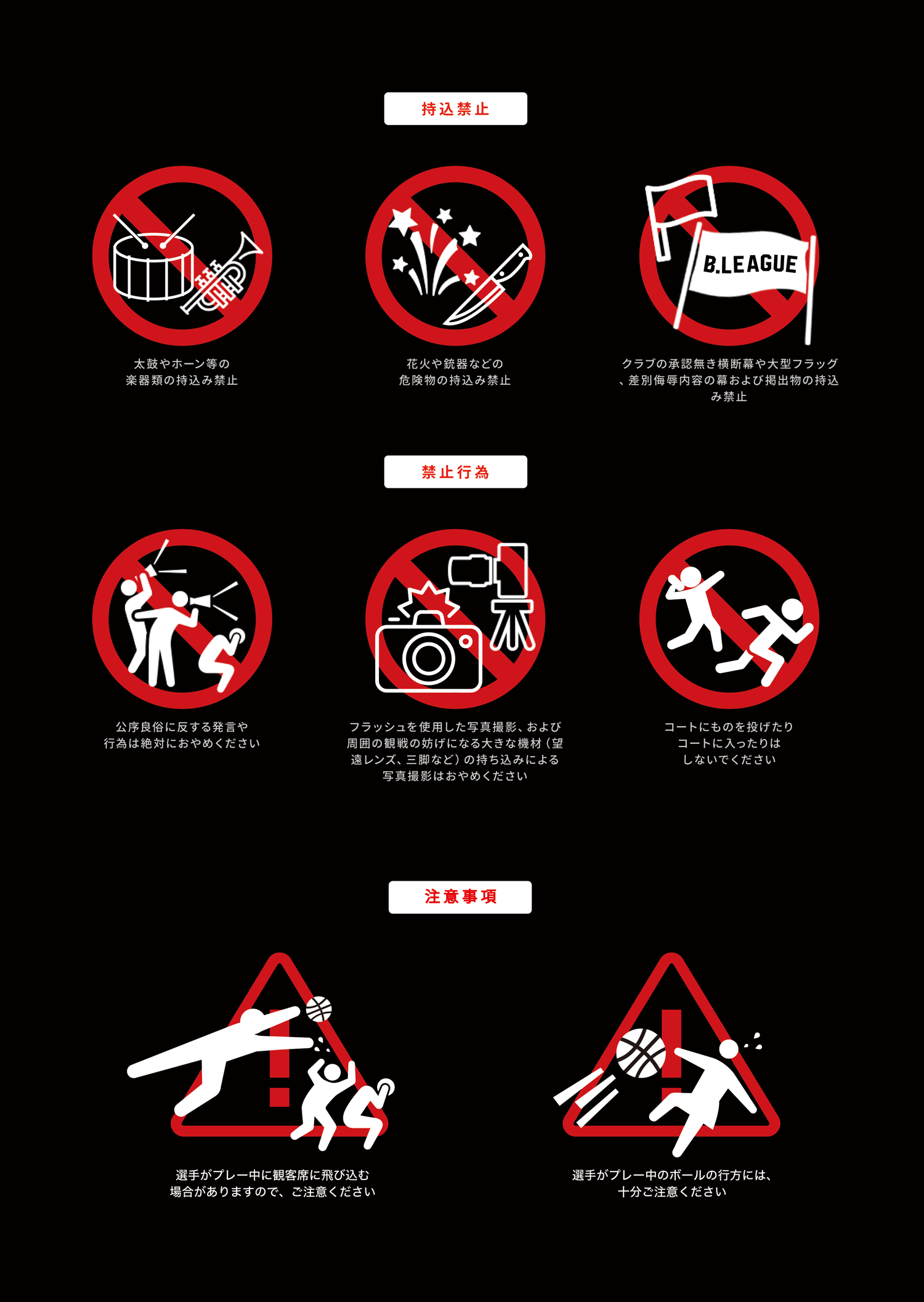 ※観戦マナー&ルールに定める禁止行為やセキュリティ上問題となる行為が行われた場合には、退場や入場禁止の処分に従っていただく場合があります。さらに、違反行為を行ったアリーナ以外の試合にも入場が禁止される場合がありますので、予めご承知おきください